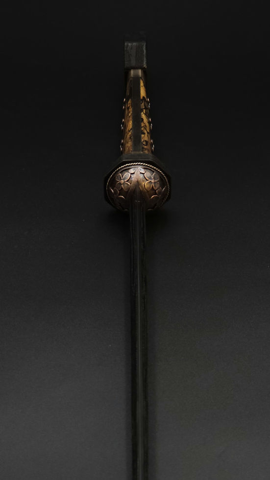 The pommel features two copper plates with a floral motif and fine silver pistil created using chasing and Repoussé techniques. These plates are inlaid into a precisely weighted wrought iron pommel, held securely in place with epoxy and peened over edges to ensure a solid construction.